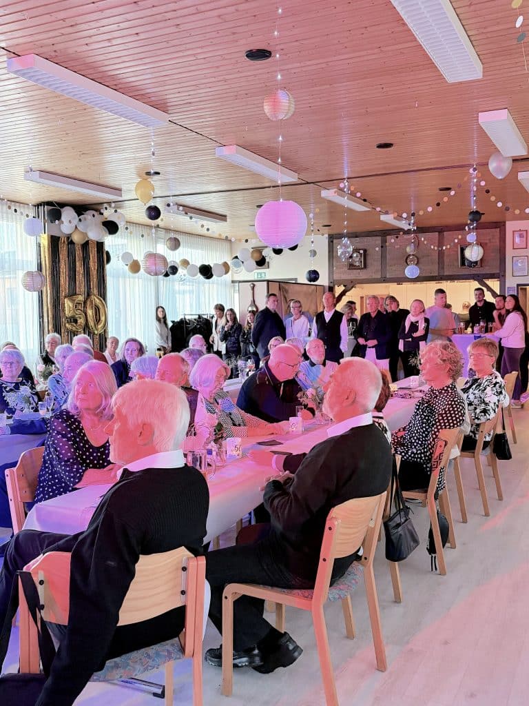 Getränke, Deko etc. wurden zum MGV transportiert, der Saal wurde hergerichtet und Gäste und Mitglieder wurden über den Ortswechsel informiert. Somit konnte die Feier wie geplant am 4. Oktober stattfinden. Ein Highlight war der Auftritt von Jürgen Wunderlich, der Stimme aus dem Bergischen. Sehr erfreulich war, dass fünf Gründungsmitglieder an der Feier teilnehmen konnten. Resümee der Gäste und teilnehmenden Mitglieder: eine gelungene und dem Anlass gebührende Veranstaltung.
